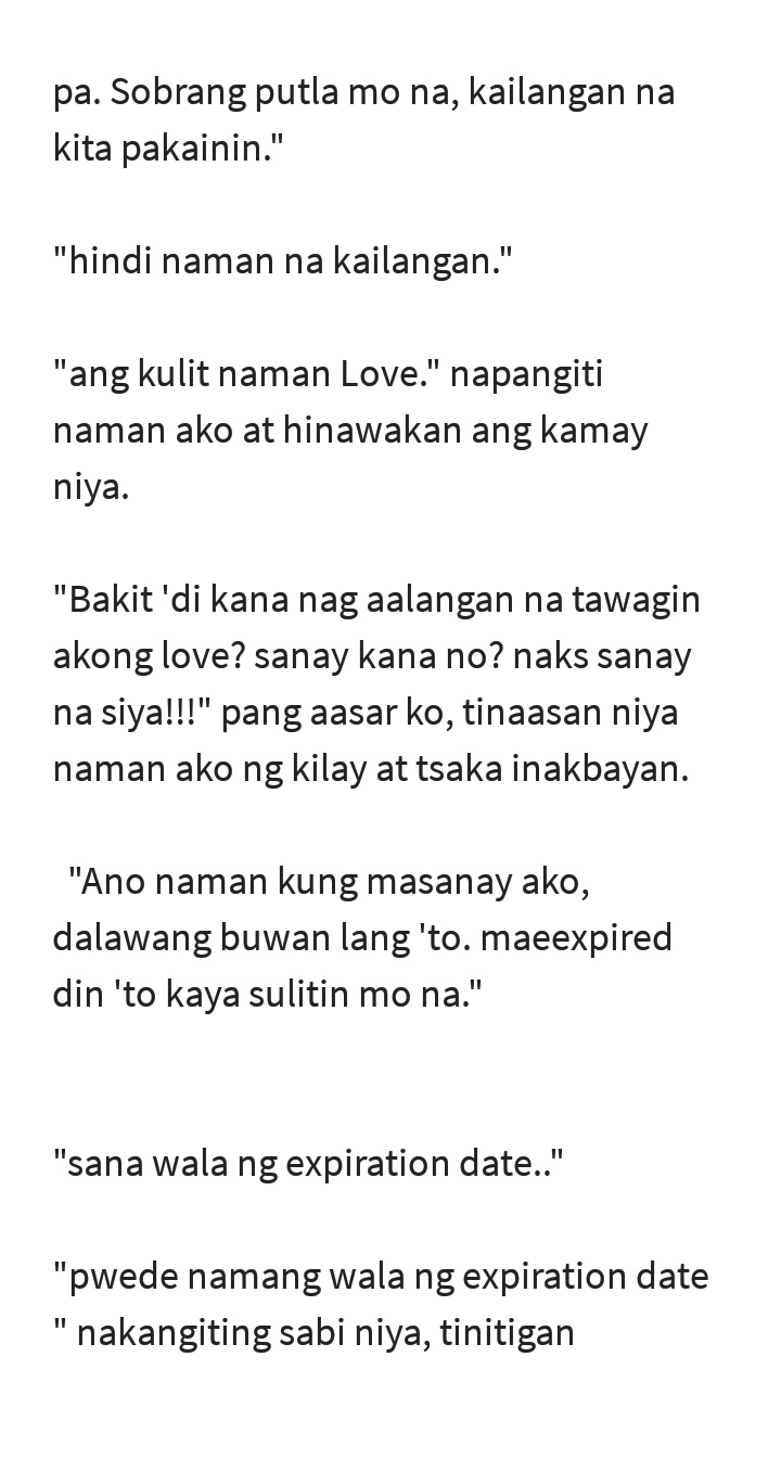 Pagkaupo niya ay iinumin na sama nya ang tubig na kinuha niya pero nagsalita ako at tinanong siya. Ako lang makikiramay sa sarili ko. Pinasok nito ang dalawang kamay sa rehas na kahoy at sinambunutan c luntian.