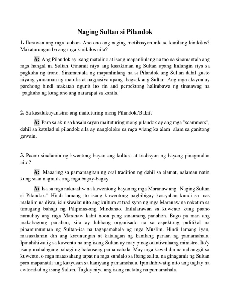 Uri ng Panitikan Ang kwentong Naging Sultan si Pilandok ay isang uri ng maikling kwento mula sa Pilipinas Bayan ng Maranaw. MyMemory Worlds Largest Translation Memory. Gusto ng Sultan na tawagin ang kanyang mga kawal upang sila ay sumama sa kanya pero pinigili niya ni Pilandok at sinabing hindi pwedeng malaman ng ibang tao ang tungkol sa kaharian sa ilalim ng dagat.