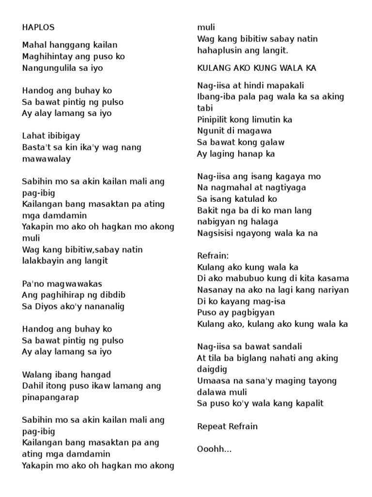 Ka sakin dahil di ko kakayanin Ang mga bagay minsan na Parokya Ni Edgar - Para sayo lyrics akoy magbabago kahit mahirap kakayanin ko dahil para sayo handa. Di ko kakayanin kung ikay mawawala sa aking piling Di. Hindi ko ginusto ang ilayo ako sayo mahal ngunit ito ang desisyon ng tadhana at may kapal alam ko din akoy magtatagal sa lugar na to na kung saan wala ka kaya kulang kulang ako hindi lang araw hindi lang buwan kundi ilang taon tayo ay di magkikita makakaya ko ba yon sa tingin ko hinde hindi ko kaya dahil akoy mamamatay kapag wala ka wala ka na dito sa aking tabi kaya di na mapigil.