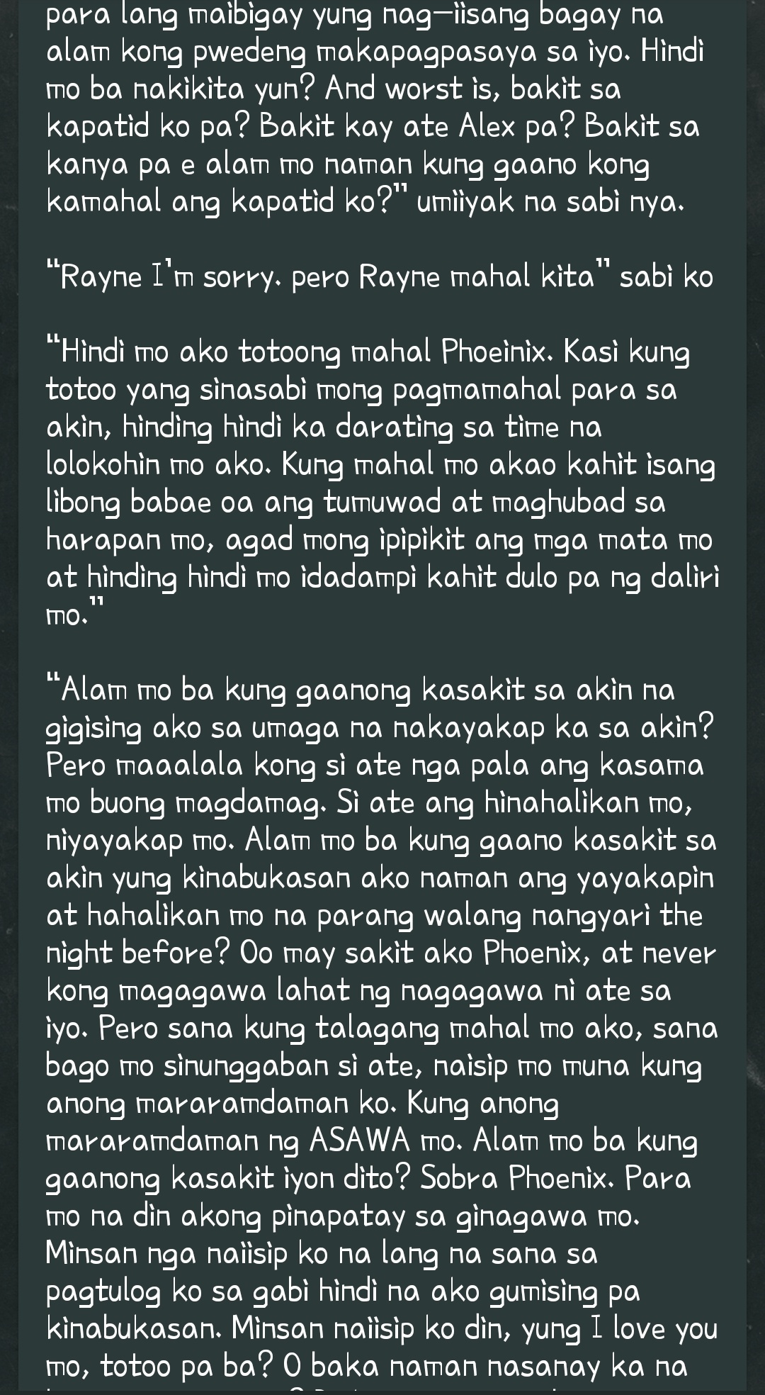 Sa iyo lahat ay paharang dahil ayaw mong magparaya. Alam ko may kasalanan rin ako kung bakit ka nahihirapan ng ganyan ngayon Napakunot ang noo ko sa kanyang tinuran. Nung una kitang makilala di man lang kita napuna di ka naman kasi ganoon kaganda di ba.
